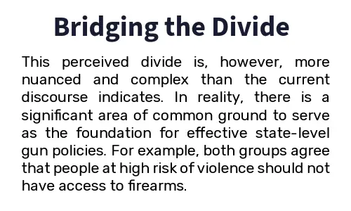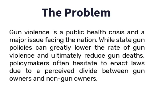 Beyond policy, we aim to change the culture around guns, shifting the discussion from an all-or-nothing situation to a carefully crafted middle ground that maximizes public health protection and minimizes interference with lawful gun owners.
